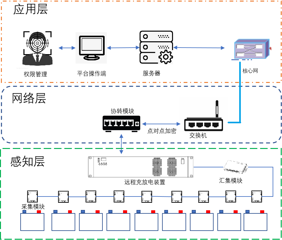 基于現(xiàn)有石化通信網(wǎng)絡(luò),研制以電池采集模塊和遠(yuǎn)程充放電裝置為物理感知層;各模塊間的通訊及控制為網(wǎng)絡(luò)交互層;智能運(yùn)維平臺軟件為平臺層的蓄電池組遠(yuǎn)程智能運(yùn)維系統(tǒng)。