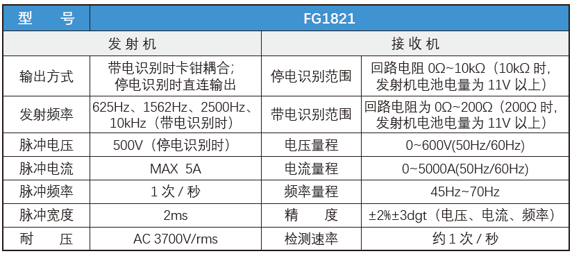 微信客服:(微信號)FG1821具有帶電電纜識別、停電電纜識別、交流電流測試、交流電壓測試功能。產品由發射機、發射電流鉗、接收機、接收柔性電流鉗等組成。